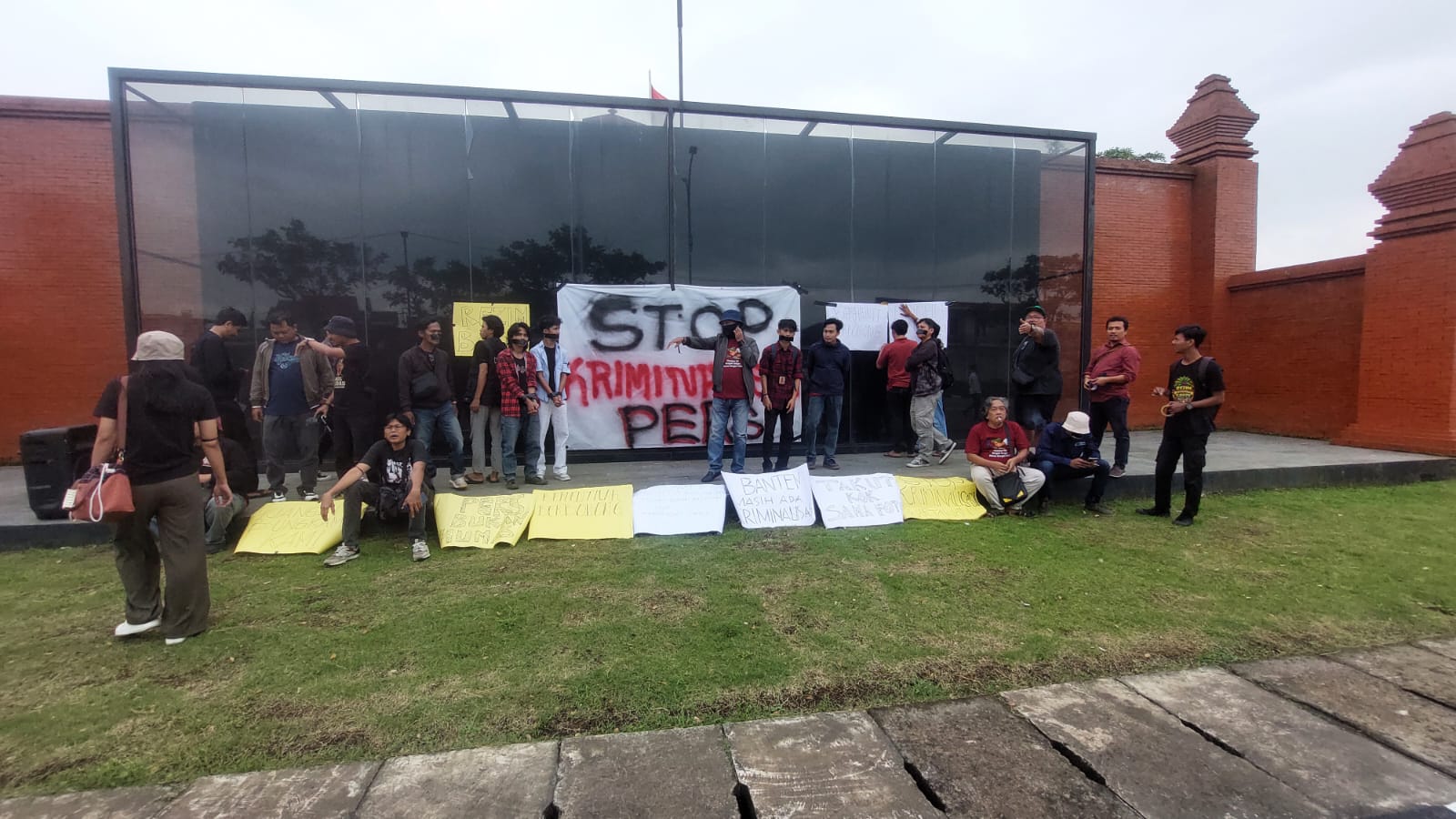 Pantauan di lokasi, massa membentangkan spanduk bertuliskan “Stop Kriminalisasi Pers” serta membawa selebaran dengan tulisan “Di Tanah Jawara, Pena Masih Dibungkam, Kebenaran Diancam Jeruji Besi”.